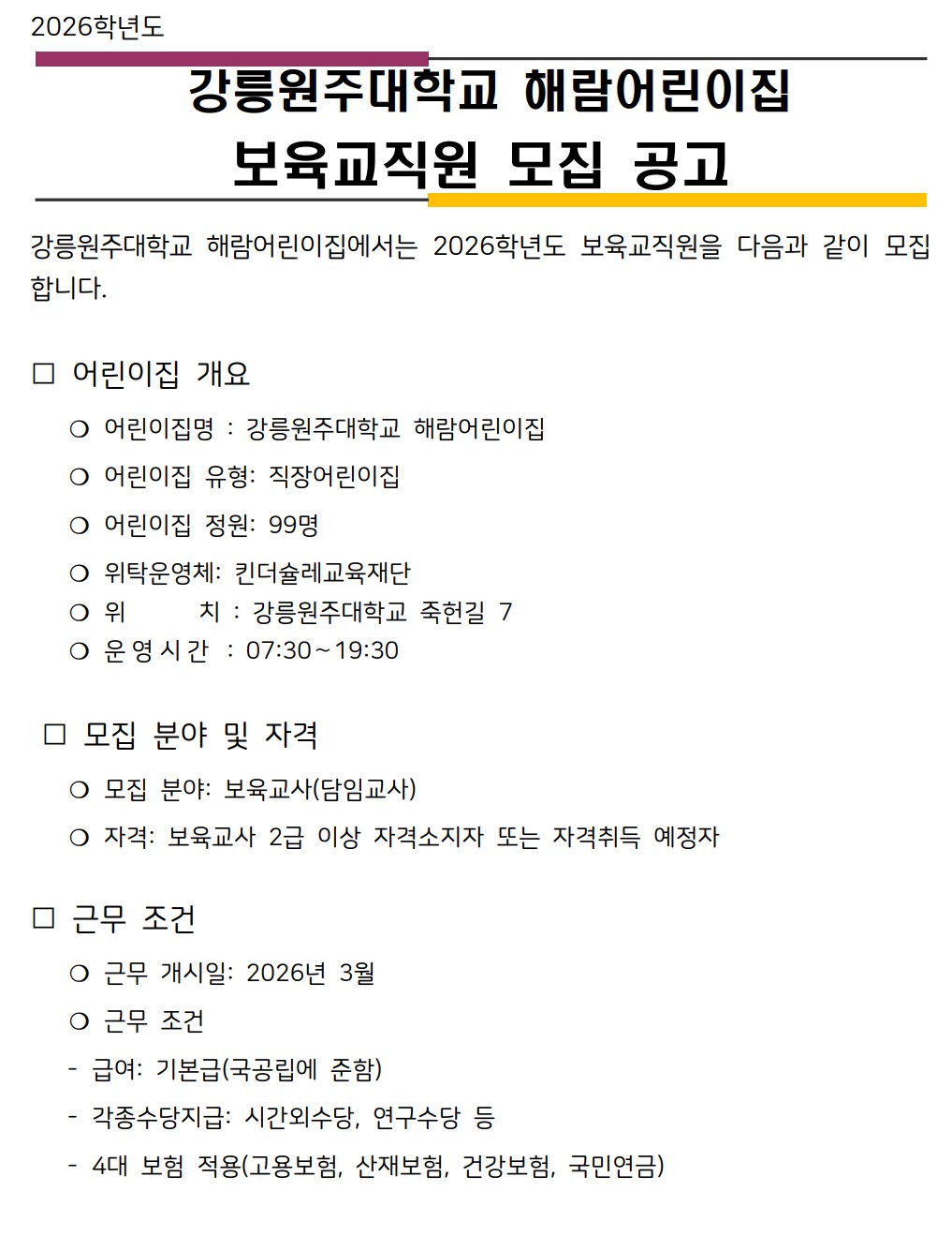 2023년 강릉원주대학교 해람어린이집 교사 채용공고