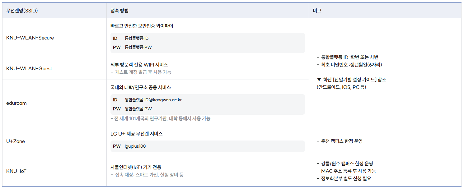 강원대학교 정보화본부 | 서비스 이용 안내 | 전체서비스 | 무선랜 서비스