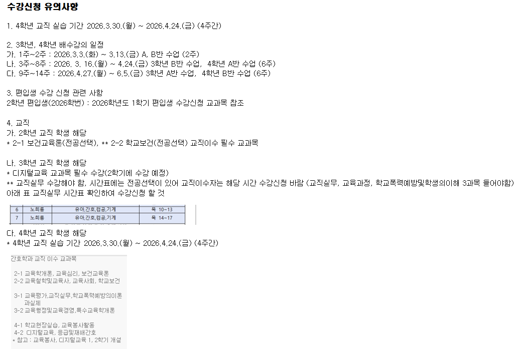 2026학년도 1학기 전공 시간표 안내